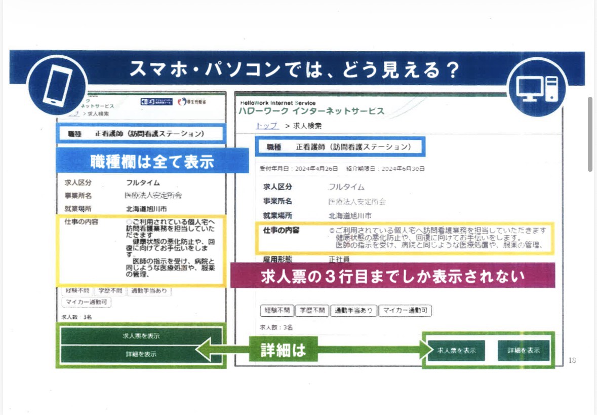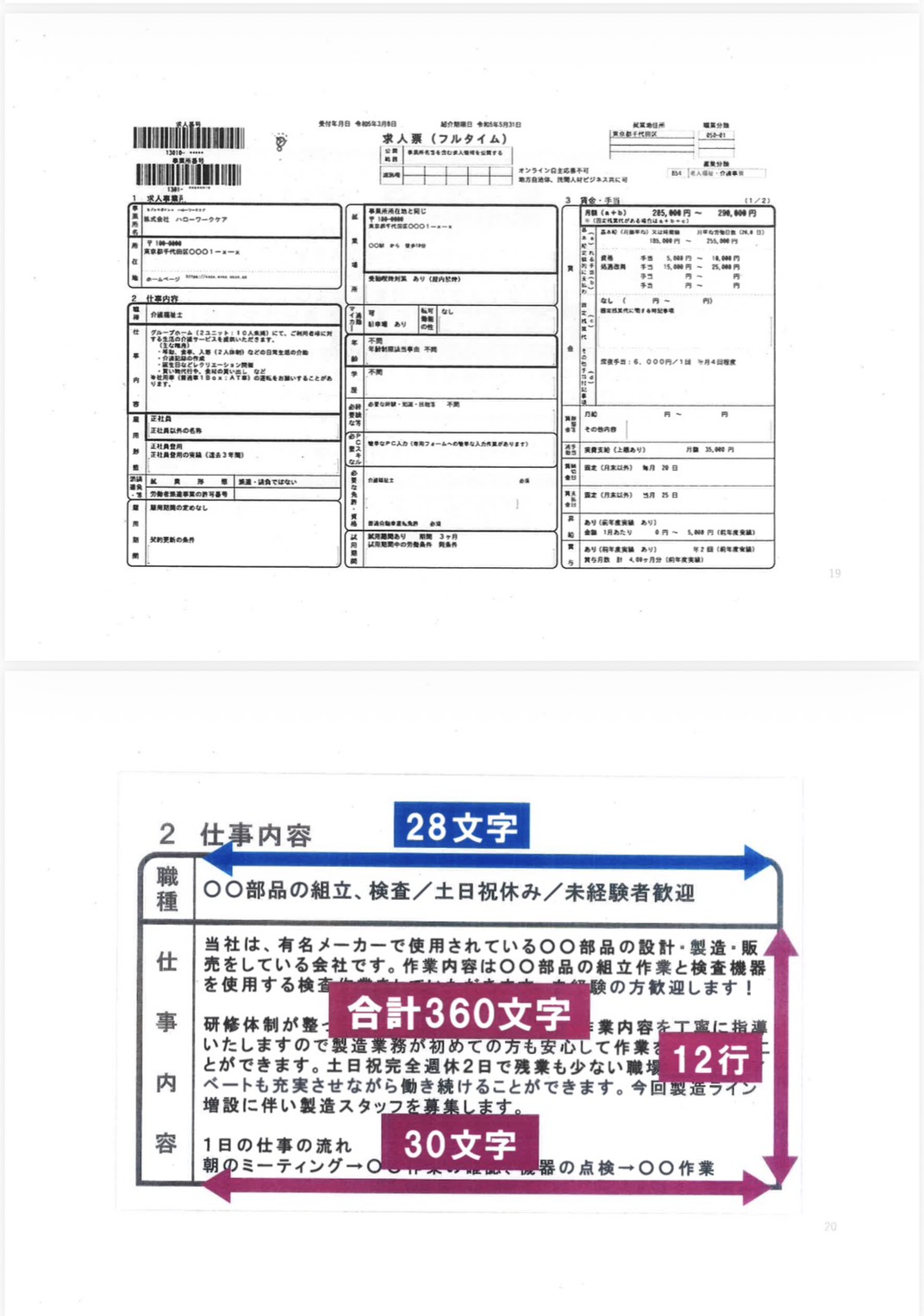 さらに、ハローワークのインターネットサービスでは、スマートフォンやパソコンの画面上で仕事内容は最初の3行までしか表示されないため、この部分で興味を持ってもらえるかどうかが大きな分かれ目になります。