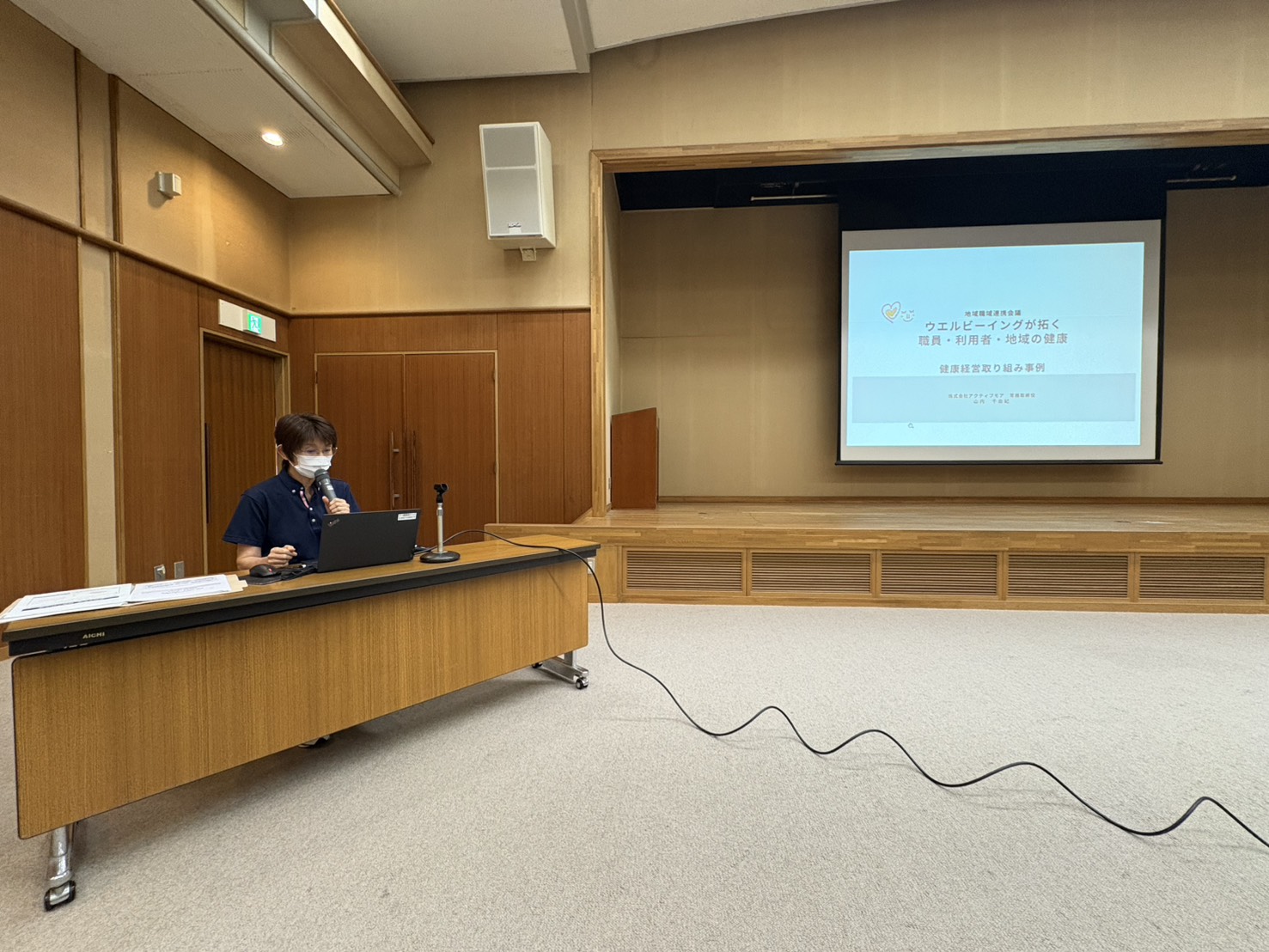 企業事例紹介では、山内常務より弊社アクティブモアの取り組みとして「ウェルビーイングを軸にした健康経営」を発表しました。